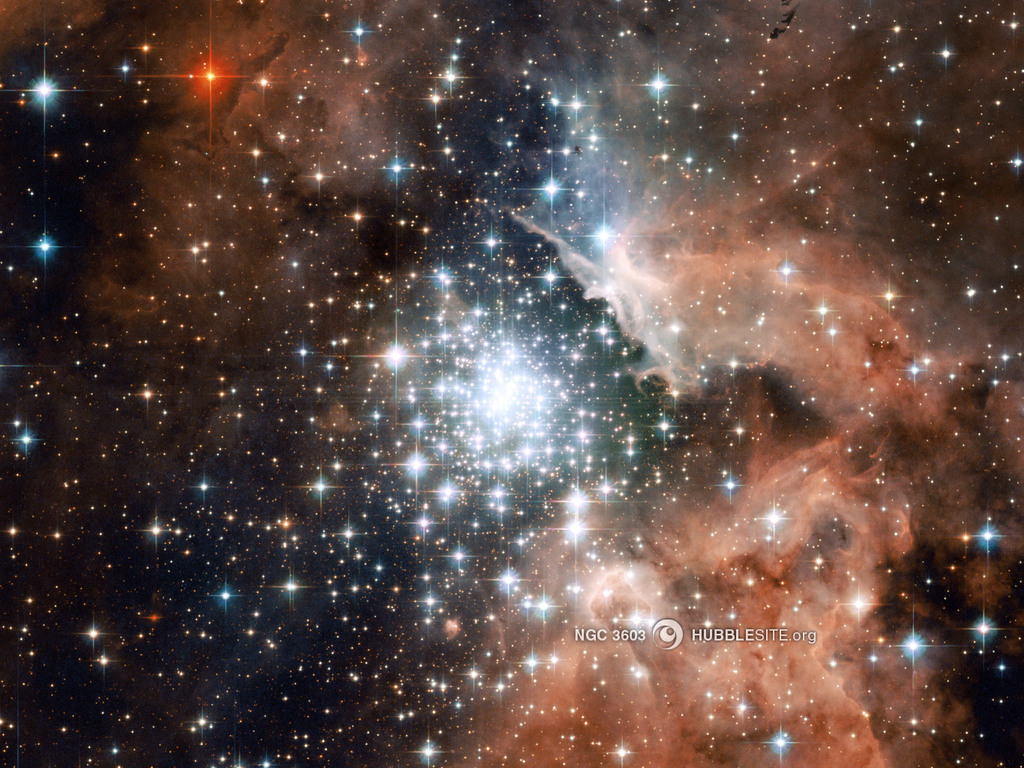Object Name: NGC 3603 Image Type: Astronomical Credit: NASA, ESA, and the Hubble Heritage (STScI/AURA)-ESA/Hubble Collaboration ABOUT THIS IMAGE: October 2, 2007 Thousands of sparkling young stars are nestled within the giant nebula NGC 3603. This stellar "jewel box" is one of the most Massive young star clusters in the Milky Way Galaxy. NGC 3603 is a prominent star-forming region in the Carina spiral arm of the Milky Way, about 20,000 light-years away. This latest image from NASA's Hubble Space Telescope shows a young star cluster surrounded by a vast region of dust and gas. The image reveals stages in the life cycle of stars. Powerful ultraviolet radiation and fast winds from the bluest and hottest stars have blown a big bubble around the cluster. Moving into the surrounding nebula, this torrent of radiation sculpted the tall, dark stalks of dense gas, which are embedded in the walls of the Nebula These gaseous monoliths are a few light-years tall and point to the central cluster. The stalks may be incubators for new stars. On a smaller scale, a cluster of dark clouds called "Bok" globules resides at the top, right corner. These clouds are composed of dense dust and gas and are about 10 to 50 times more massive than the Sun. Resembling an insect's cocoon, a Bok globule may be undergoing a gravitational collapse on its way to forming new stars. The nebula was first discovered by Sir John Herschel in 1834. The image spans roughly 17 light-years and was taken Dec. 29, 2005 with the Advanced Camera for Surveys.