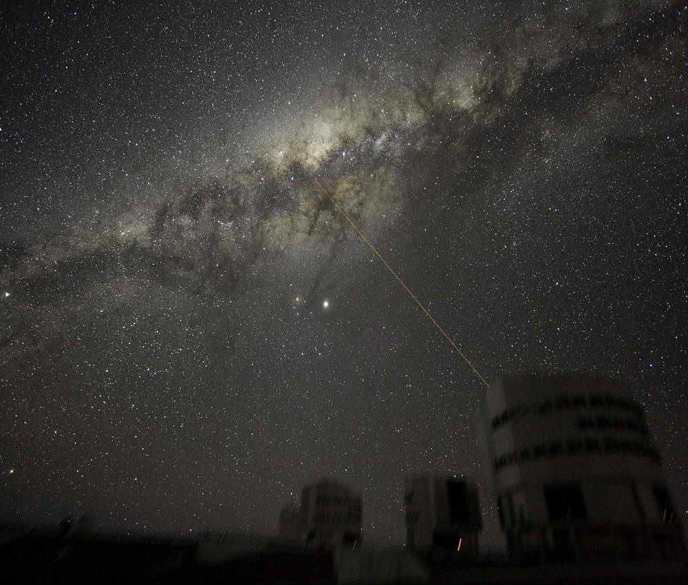 Three of the four 8.2-m telescopes forming ESO's VLT are seen dimly, with a laser beaming out from Yepun, Unit Telescope number 4. The laser points at the Galactic Center of the Milky Way, our galaxy. The bright object at center is Jupiter, while the other is Antares.