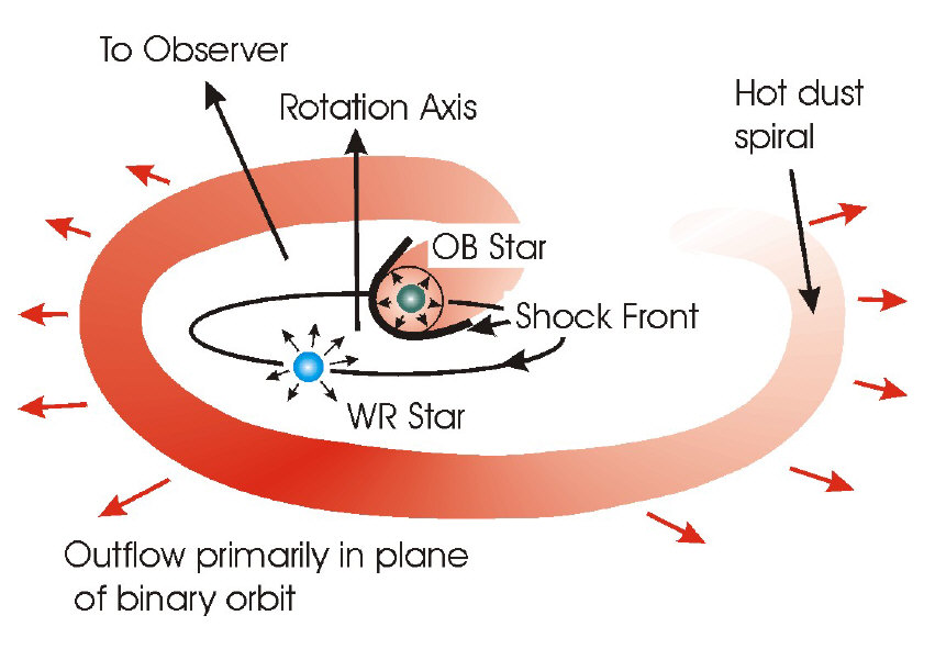 Wolf-Rayet Stars, named for the two astronomers that discovered them, are hot massive luminous stars. They are typically 3 times bigger than our Sun, a Yellow Dwarf Star, and 25 times heavier than our Sun! A Wolf-Rayet Star would be 100,000 times brighter than our Sun. That is about the same as the way Our Sun outshines our Moon! Wolf-Reynet 104 is actually a Binary Star System. The companion star is not as big as Wr 104 but is a luminous Blue OB Star with a strong stellar wind. These two stars orbit each other every 220 days. Massive Stars like WR 104 end their lives by Super Nova Explosion and some form a Black Hole and give off a deadly Gamma Ray Burst (GRB). Gamma Rays are extremely powerful and just as the Black Hole is forming two very tightly focused beams, like a flash light beam, of Gamma Ray radiation are shot out of the north and south orbital poles of the Star. These two beams are extremely powerful and can travel thousands of light years destroying everything in their path. The Earth my be online with one of these beams! All the data is not in yet however and WR 104 is 8,000 light years from Earth. Watch for my article on Death Star WR 104 coming soon. For now you should read my article on "The Birth & Death of Our Sun" for more info on Stellar Evolution which will help you understand the coming articles on Death Star WR 104 and black holes. You should also read my article "Basic Gravity" for a better understanding of Stellar Evolution.
